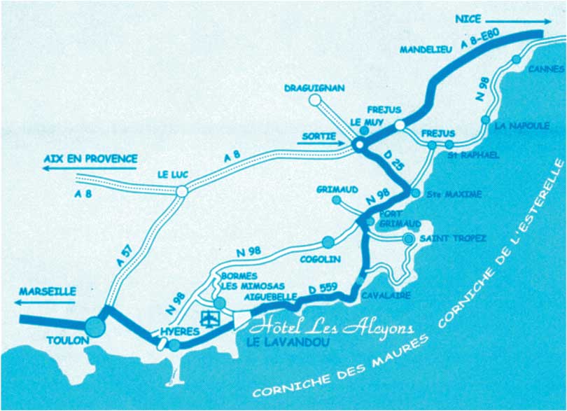 Traverser Marseille par tunnel, prendre direction Toulon et traverser Toulon. A la sortie de Toulon direction Hyères, puis Le Lavandou. A 4 kms après Le Lavandou, Aiguebelle Plage.